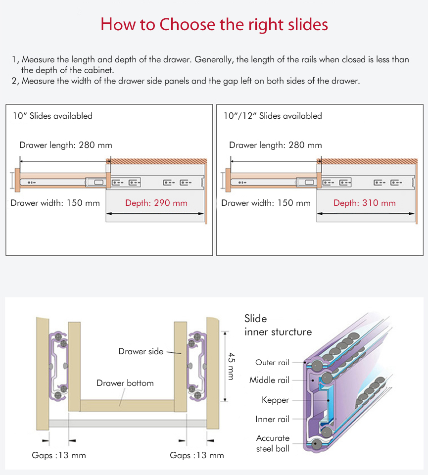 【HIGH QUALITY】The drawer slides are made of high-quality steel, which is durable and sturdy. Moreover, the soft-close drawer slides will not rust or bend. The size of the side-mount drawer slides are standard and suitable. In order for the package to reach you intact, all drawer slide glides are well packaged.